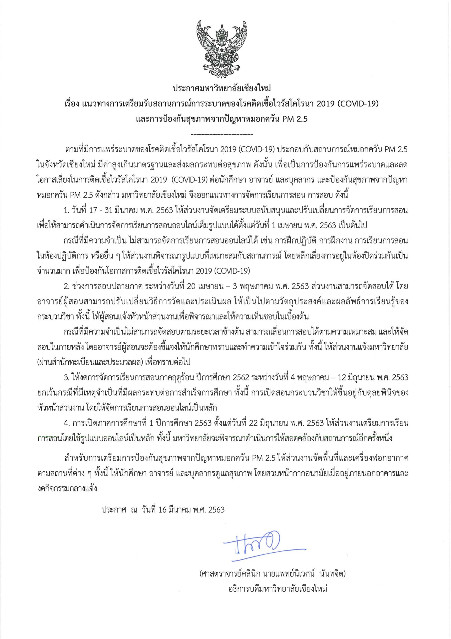 ประกาศมหาวิทยาลัยเชียงใหม่ เรื่อง แนวทางการเตรียมรับสถานการณ์การระบาดของโรคติดเชื้อไวรัสโคโรนา 2019 (COVID-19) และการป้องกันสุขภาพจากปัญหาหมอกควัน PM 2.5 |