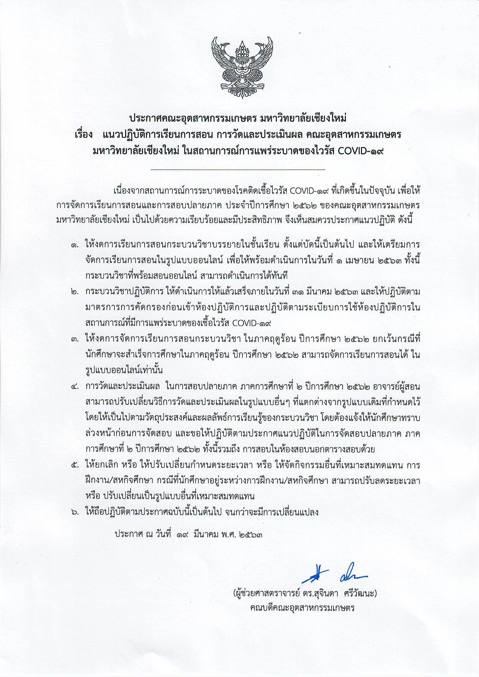 ประกาศคณะอุตสาหกรรมเกษตร มหาวิทยาลัยเชียงใหม่ เรื่อง แนวปฏิบัติการเรียนการสอน การวัดและประเมินผล คณะอุตสาหกรรมเกษตร มหาวิทยาลัยเชียงใหม่ ในสถานการณ์การแพร่ระบาดของไวรัส COVID-19 ลงวันที่ 19 มีนาคม 2563 |