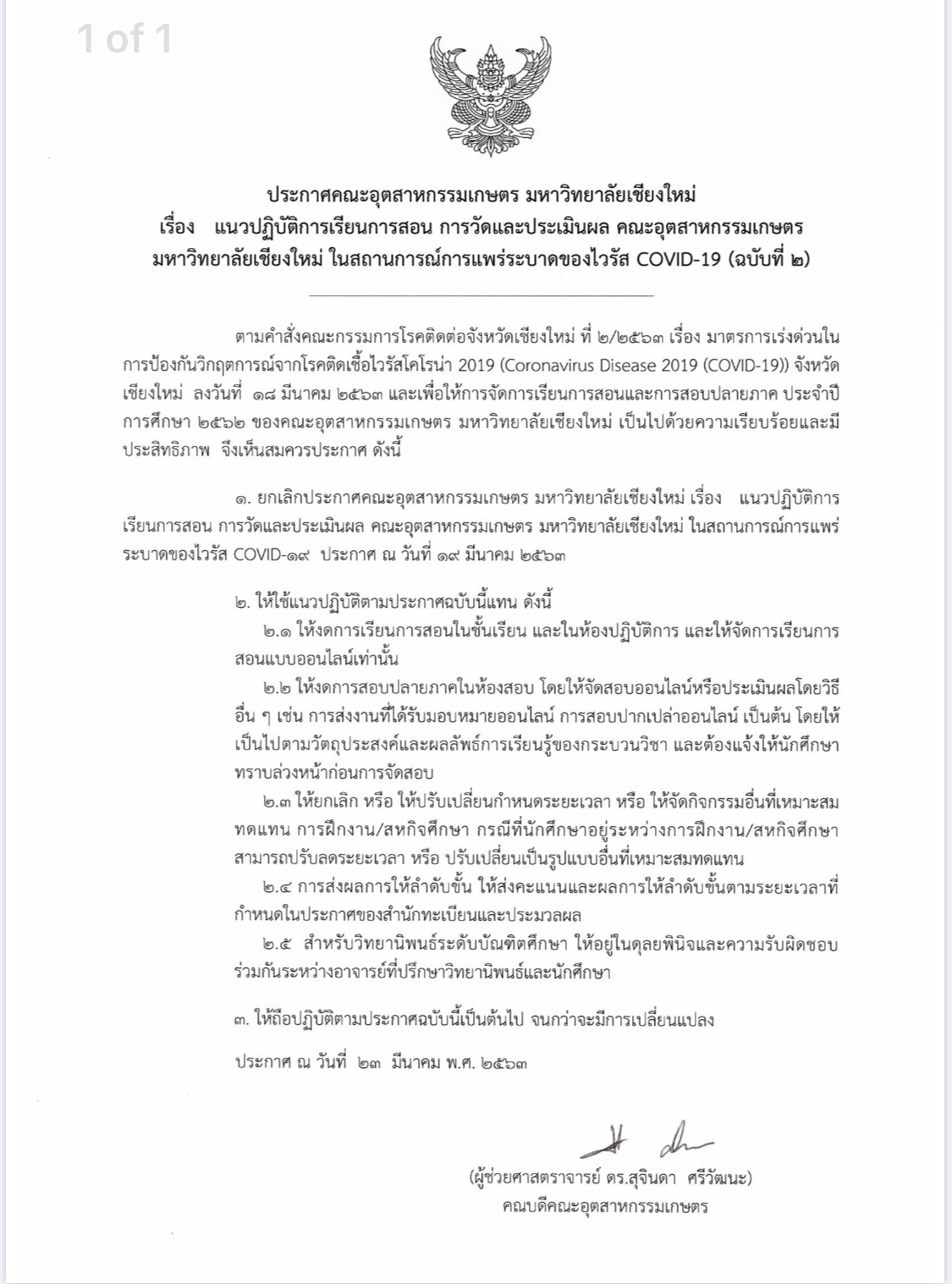 แนวปฏิบัติการเรียนการสอน การวัดและประเมินผล คณะอุตสาหกรรมเกษตร มหาวิทยาลัยเชียงใหม่ ในสถานการณ์การแพร่ระบาดของไวรัส COVID-19 (ฉบับที่ 2) ลงวันที่ 23 มีนาคม 2563 |