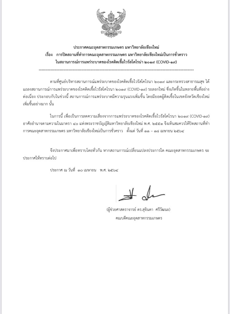 ประกาศคณะอุตสาหกรรมเกษตร มหาวิทยาลัยเชียงใหม่ เรื่อง แนวทางการปฏิบัติงานของบุคลากรคณะอุตสาหกรรมเกษตร ในลักษณะการทำงานที่บ้าน (Work from Home) ในสถานการณ์การระบาดของโรคติดเชื้อไวรัสโคโรนา 2019 (COVID-19) และการป้องกันสุขภาพจากหมอกควัน PM 2.5 |